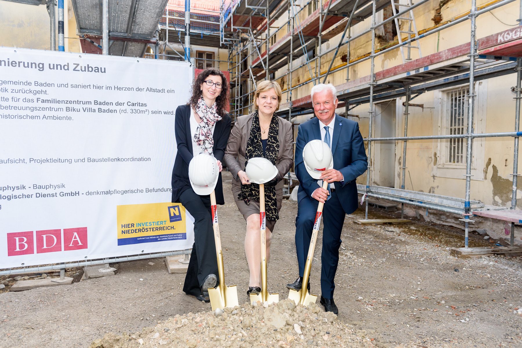 Am Freitag, 15. April 2016 wurde im Beisein von !Biku-Prokuristin Carina Donabauer und Villa-Leitung Mag.a Katrina Zachhuber mit dem Spatenstich feierlich der Aus-und Umbau der neuen !Biku Villa Baden eröffnet. Der neue Standort in der Renngasse 7 wird - unweit der bestehenden Kinderbetreuungseinrichtung - komplett neu aufgebaut und modernisiert. Ab Herbst 2016 werden in vier Gruppen Kinder ab einem Jahr zweisprachig betreut. Liebevolle sowie individuelle Föderung und Forderung liegen dem Angebot zu Grunde und ein reichhaltiges Sprachkursangebot rundet das Package ab. Wir freuen uns besonders über die positive Resonanz und wünschen dem Baden-Team viel Erfolg! Unter baden@biku.at können Sie einen Besichtigungstermin vereinbaren - wir freuen uns auf Sie und Ihr Kind! (Foto: Johann Fimberger)