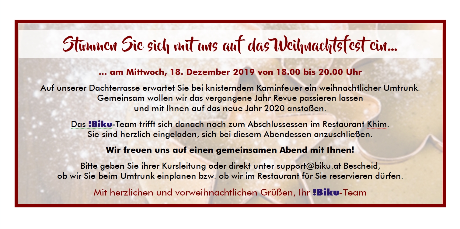 Auf Grund der schrittweisen Lockerungen der Covid-19 Sicherheits-Maßnahmen freuen wir uns Ihnen mitteilen zu dürfen, dass ab Montag, 11.05.2020 wieder folgende Präsenztrainings vor Ort im !Biku Center in der Schneckgasse 14 in St. Pölten stattfinden werden:
